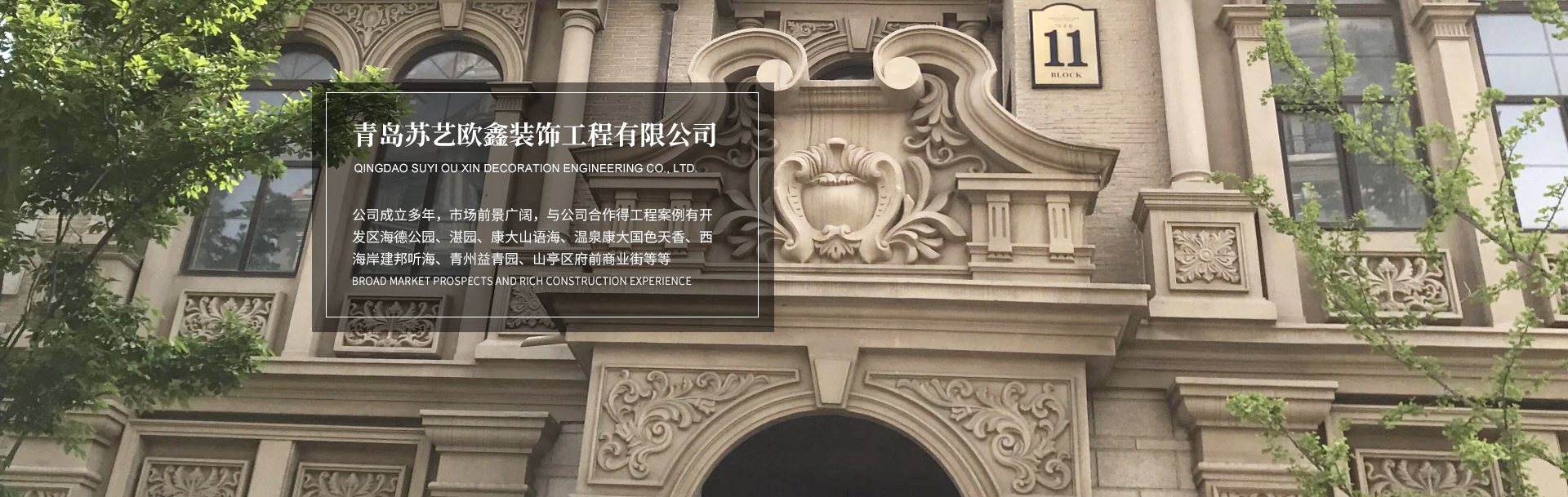 青島蘇藝歐鑫裝飾工程有限公司是一家專業服務于外墻裝飾(GRC、EPS)的深化設計、生產及施工的企業,公司始建于2004年,前身為平度市宏達歐式建筑材料廠,坐落于:青島市平度市白沙河街道張戈莊南村張梁路18號。近二十幾年的不斷發展下,我公司業務先后在山東省內、江蘇北部、河北等地區逐漸發展,工程案例有青島開發區海德公園、湛園、康大山語海、溫泉康大國色天香、西海岸建邦聽海、青州益青園、山亭區府前商業街、煙臺漁人碼頭、保利.科創紫金閣E區別墅、濟南歷山雙語學校、青島崔家溝安置區、青島金茂智慧新城、青島星河灣、青州十里春風...